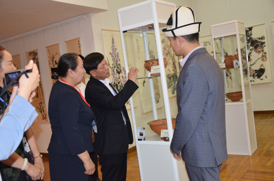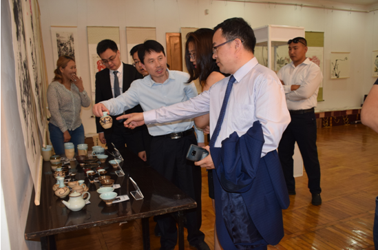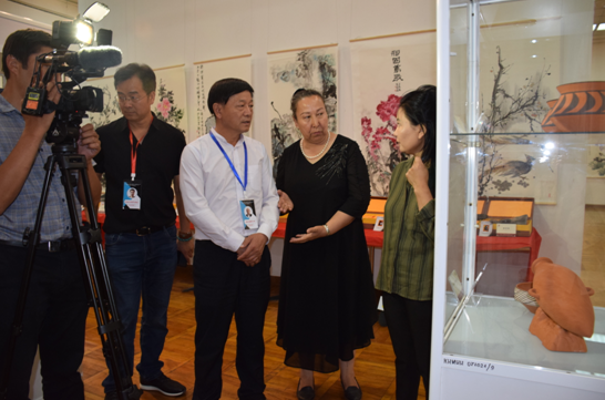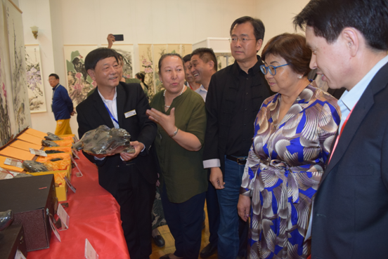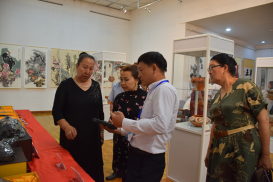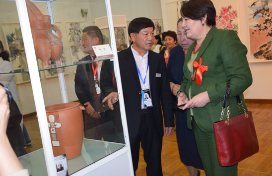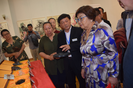 公司總經(jīng)理劉新安為吉爾吉斯斯坦前總統奧通巴耶娃講解黃河澄泥硯《九九歸一硯》